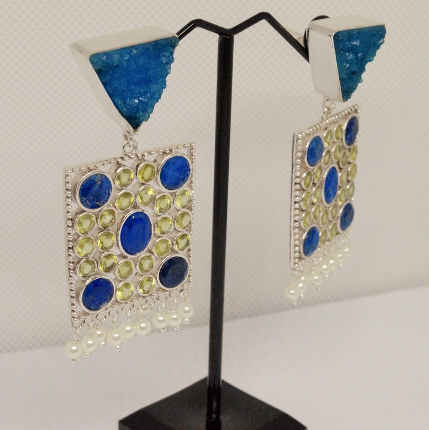 Blauer Achat, Lapis, Peridot Silber Ohrringe, Lapis Lazuli Ohrringe, August, Dezember Geburtsstein, Einzigartige indische Druzy Ohrringe, Geschenk für Sie