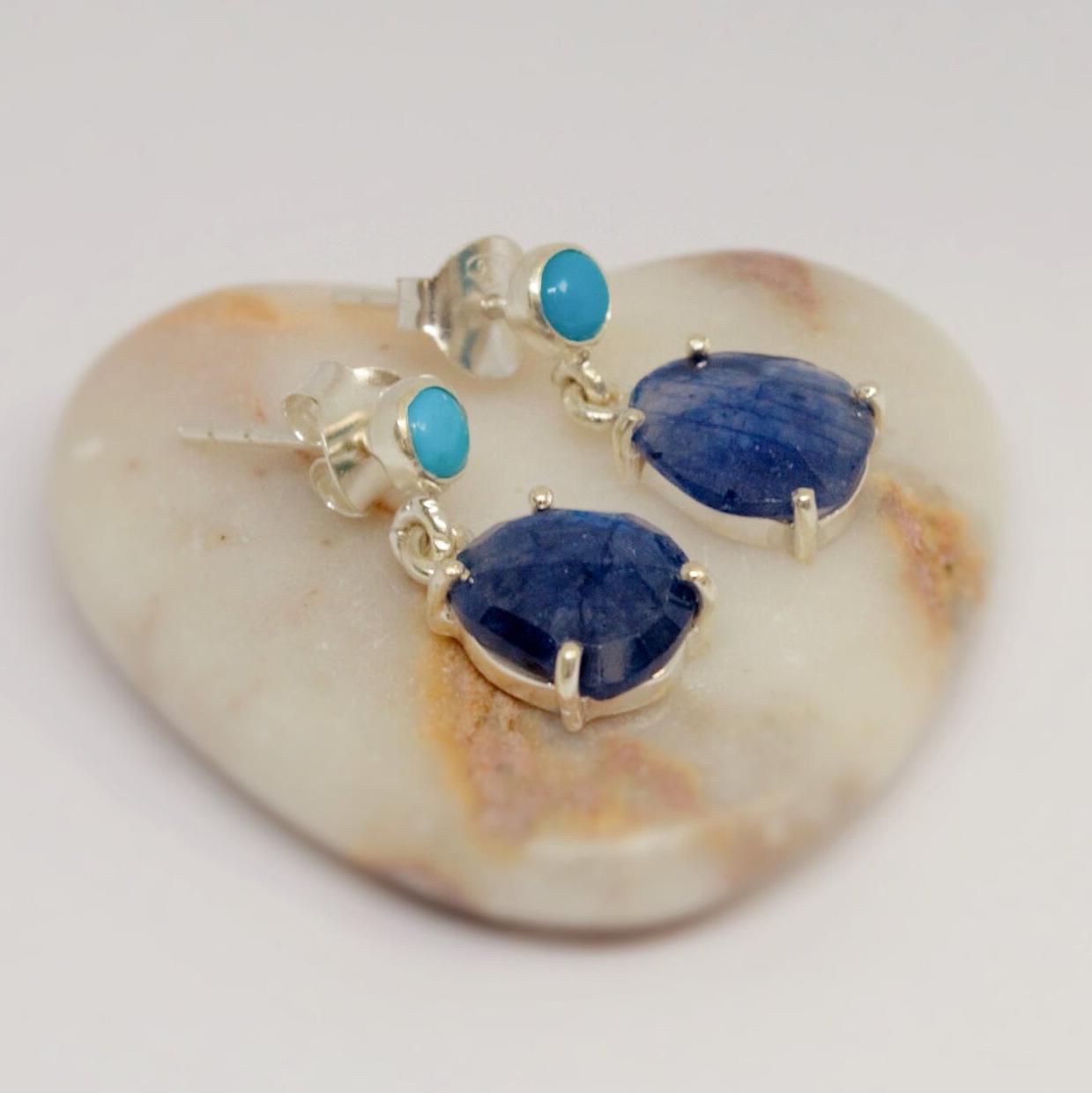 Werten Sie ihren Stil mit blauen Saphir- und Türkisohrringen auf, einer umwerfenden Kombination aus den Geburtssteinen für September und Dezember. Diese tropfenförmigen Ohrringe aus Sterlingsilber sind eine wunderschöne Kombination aus Saphirschmuck und Türkisschmuck und sind somit eine perfekte Ergänzung für jede Sammlung. Sie eignen sich ideal als hübsche Edelsteinohrringe oder handgefertigte Ohrringe und sind ein aufmerksames Geschenk zum Geburtstag, Jahrestag, Valentinstag oder Weihnachten für sie. Diese Ohrringe bieten einen lebendigen Farbtupfer mit blauen Ohrringen, die sowohl elegant als auch auffällig sind. Das Design der baumelnden Tropfenohrringe verleiht Raffinesse und macht sie ideal für informelle und formelle Anlässe. Mit der Kombination des Charmes von Saphirohrringen und türkisfarbenen Ohrringen sind diese Ohrringe ein zeitloses Schmuckstück, das ihren Stil aufwertet und über Jahre hinweg geschätzt wird.