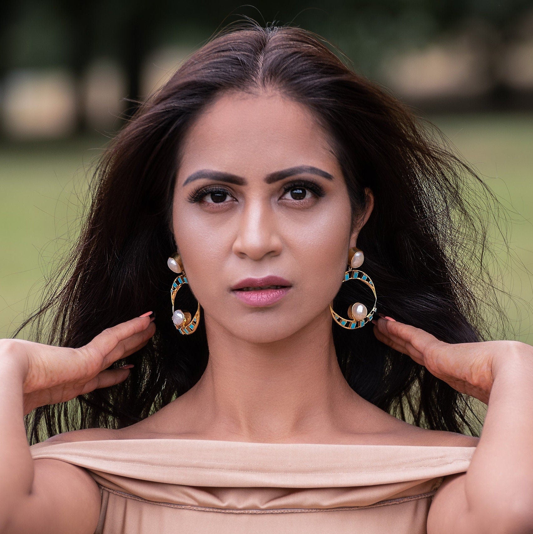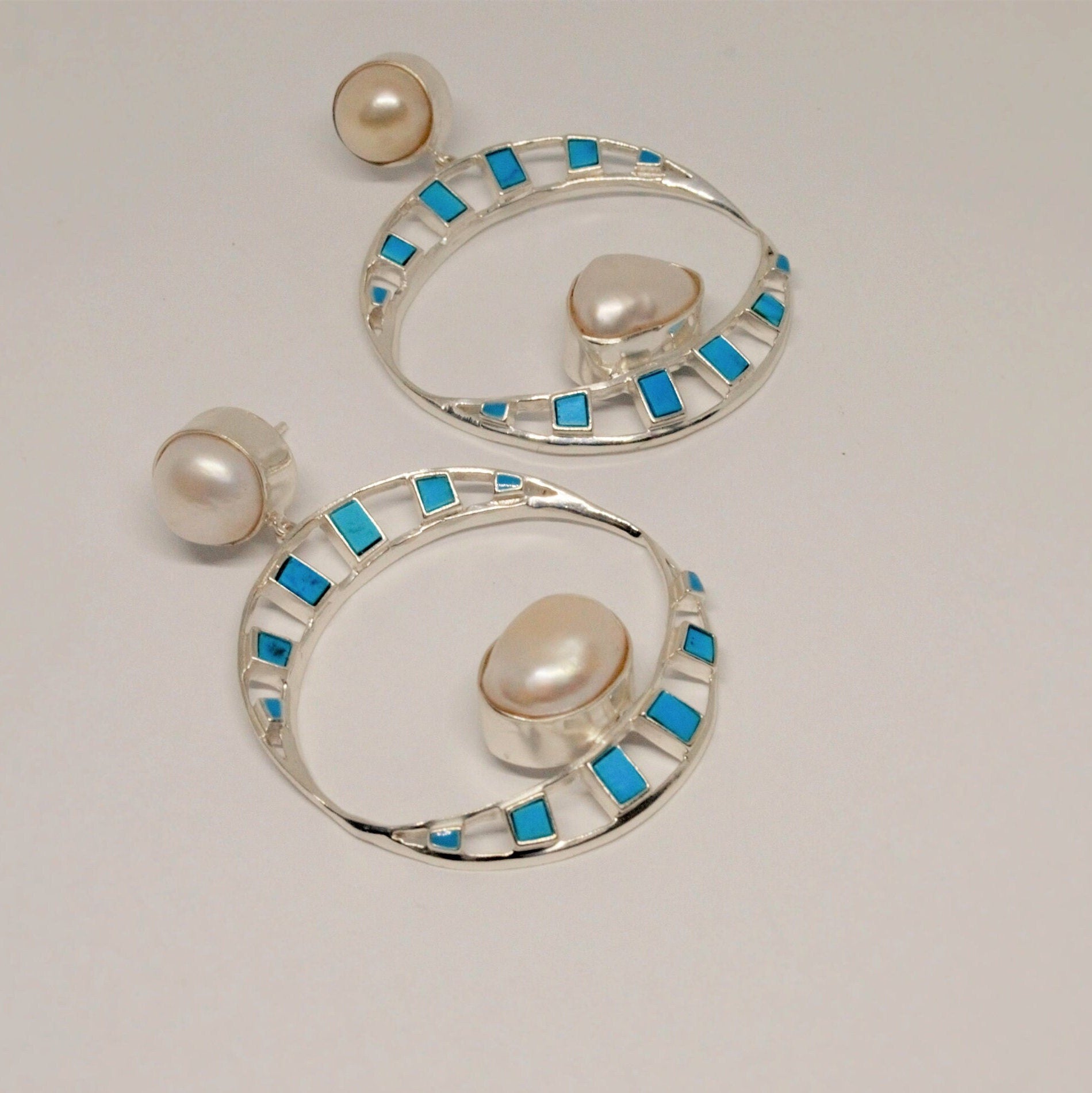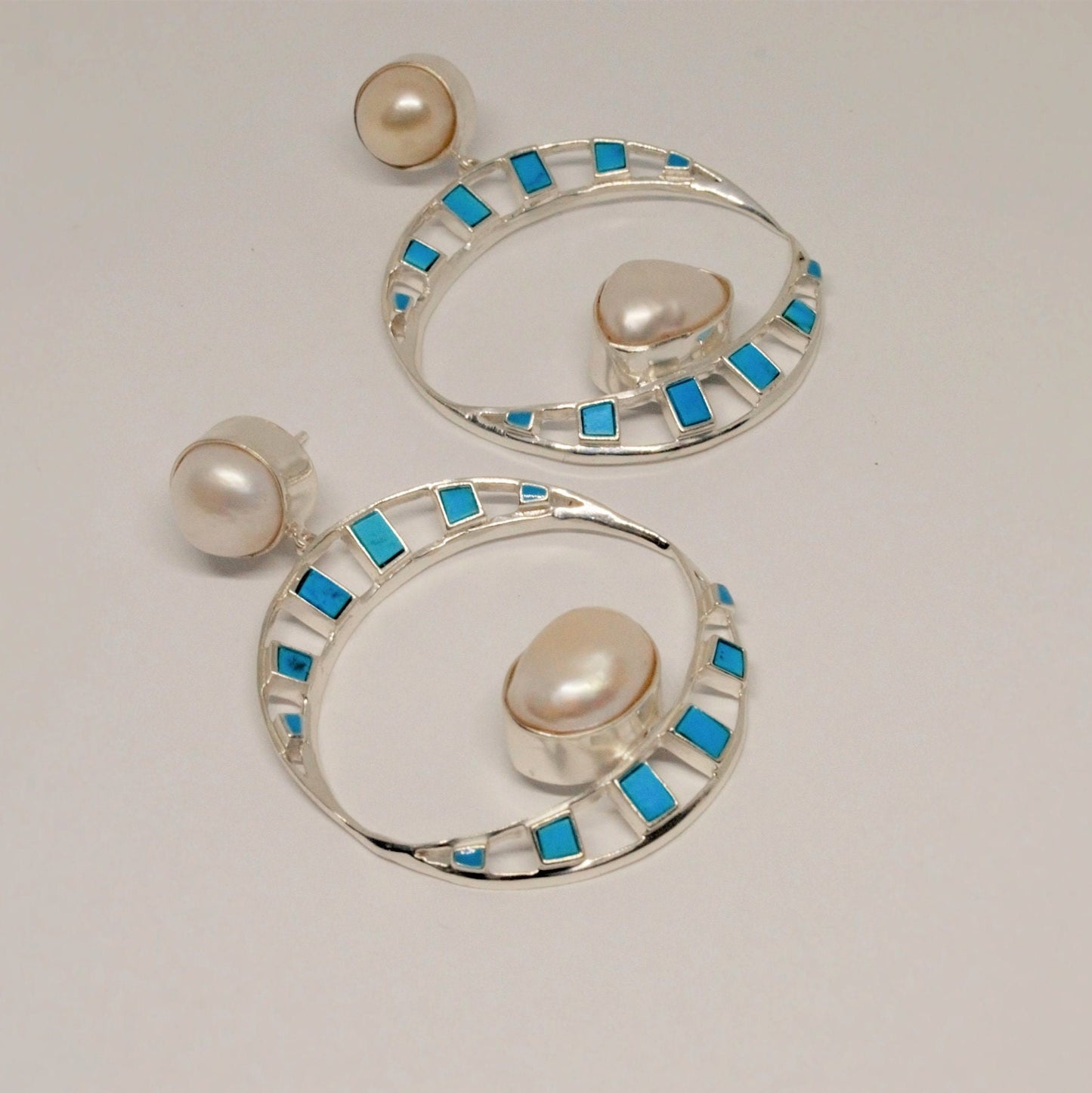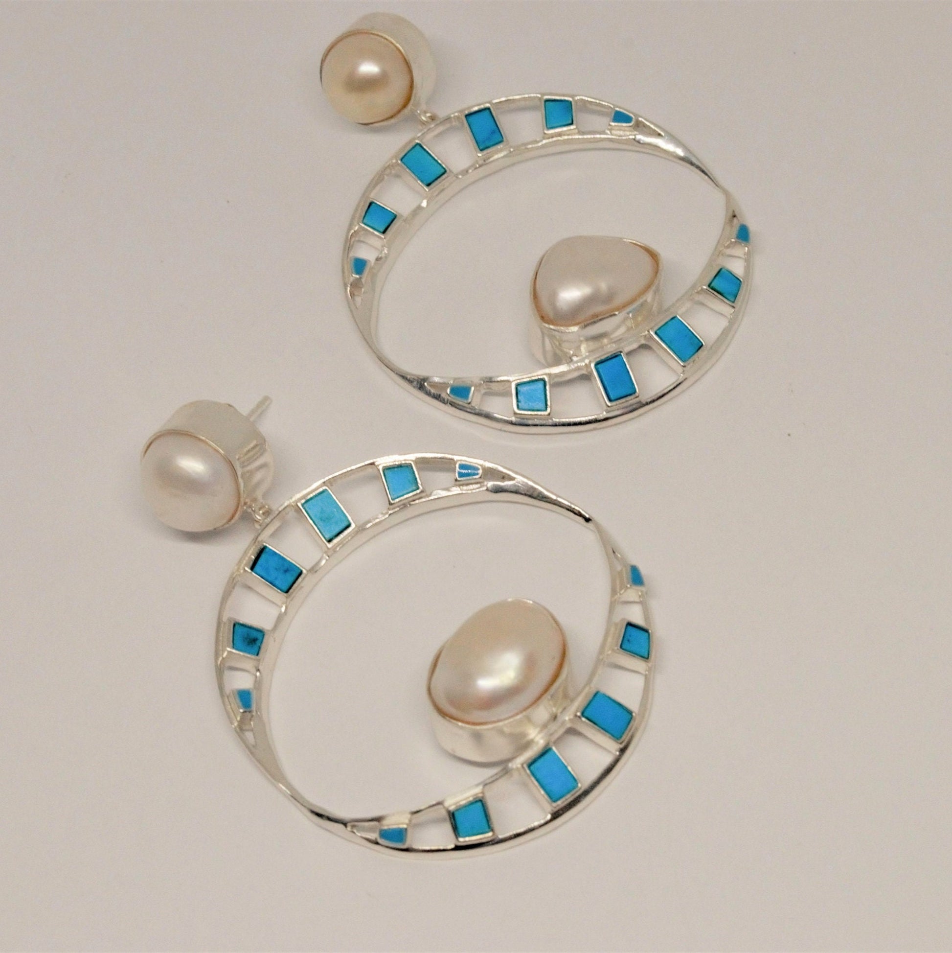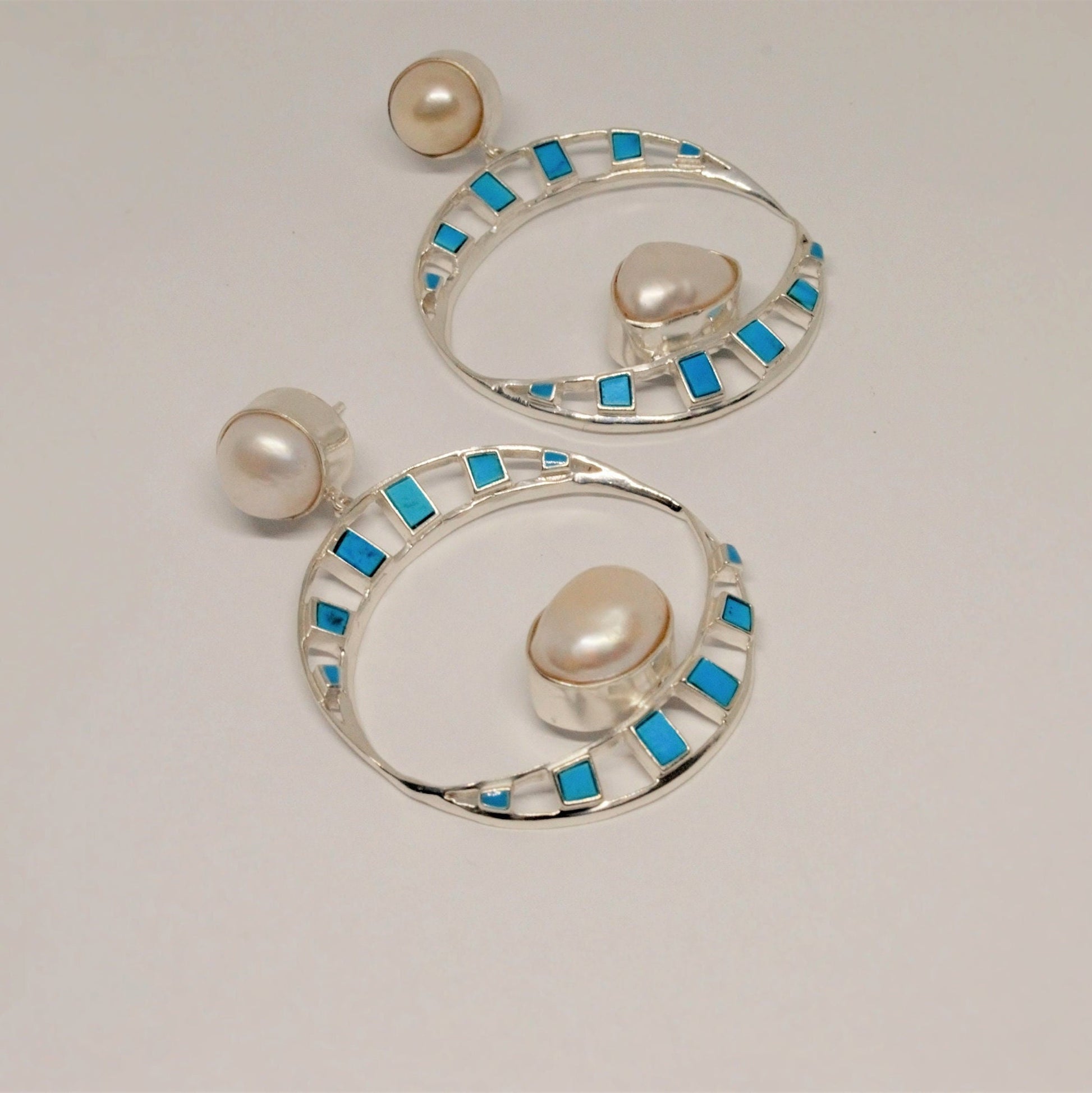 Verleihen Sie Ihrer Sammlung zeitlose Eleganz mit diesen Sterlingsilber-Ohrringen mit Perlen und Türkis, einer perfekten Mischung aus Raffinesse und Charme. Diese aus Sterlingsilber gefertigten Ohrhänger bestehen aus leuchtenden Perlenohrringen, die den Geburtsstein für Juni feiern, gepaart mit leuchtenden Türkisohrringen, die den Geburtsstein für Dezember ehren. Diese Edelsteinohrringe sind ideal für diejenigen, die einzigartige Ohrringe suchen, die traditionelle Kunstfertigkeit mit modernem Design vereinen. Die filigrane Handwerkskunst macht sie zu exquisiten, zierlichen Ohrringen, während ihre kräftigen Farben sie zu atemberaubenden Geburtssteinohrringen machen. Ob Sie nach Perlenschmuck, Türkisschmuck oder vielseitigen Silberohrringen suchen, diese indischen Jhumka-Ohrringe sind eine herausragende Wahl. Sie wurden sorgfältig als unvergessliches Geschenk entworfen und bieten Schönheit und Eleganz, perfekt zur Unterstreichung Ihres Stils oder als Geschenk für sie.