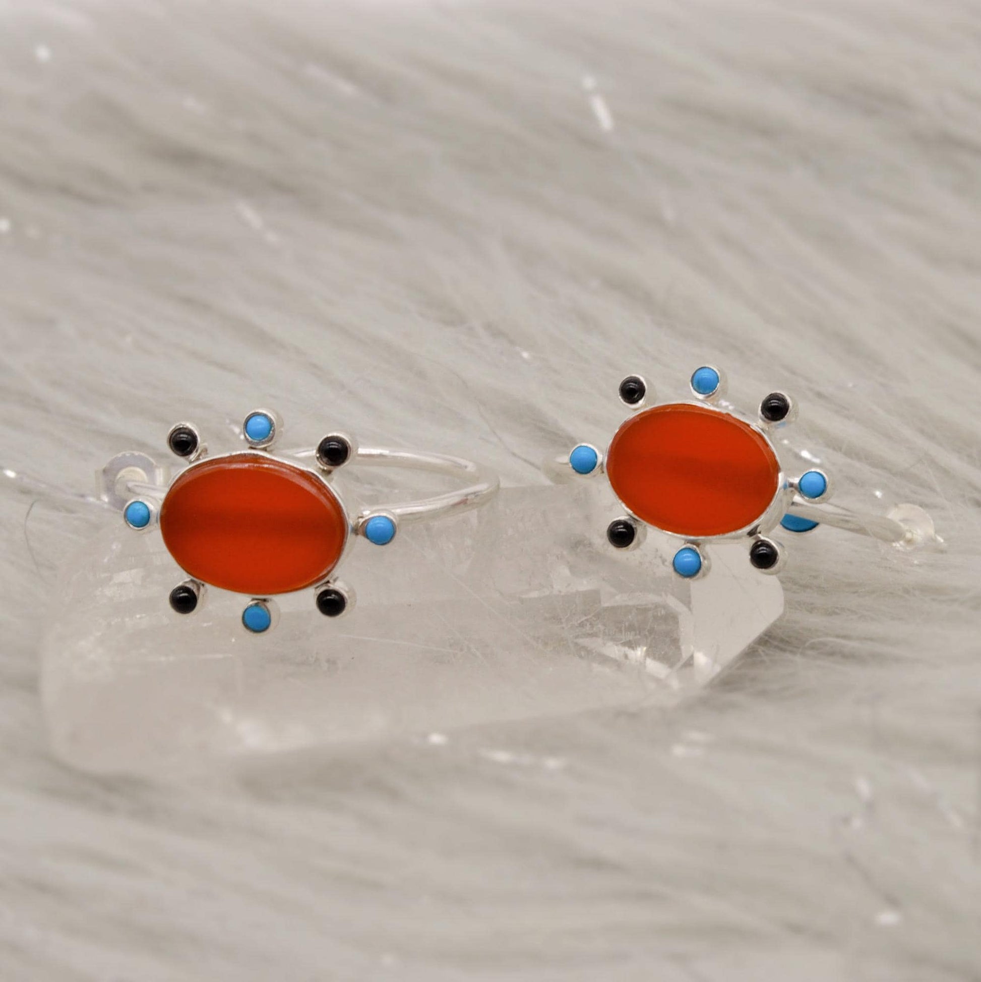 Add a bold touch to your jewelry collection with these Black Onyx, Turquoise, and Carnelian Earrings. Crafted in sterling silver, these silver earrings feature vibrant turquoise earrings, striking carnelian earrings, and deep black onyx earrings, offering a unique contrast of colors. Perfect for any occasion, these gemstone earrings are a statement piece that will elevate your look. Whether you’re looking for turquoise jewelry, carnelian jewelry, or versatile birthstone earrings, these earrings are an excellent choice. The combination of gemstones makes these earrings a thoughtful gift for her or a special treat for yourself. Celebrate the beauty of the December birthstone with the inclusion of turquoise earrings and black onyx jewelry. These unique earrings are the perfect blend of elegance and natural beauty.