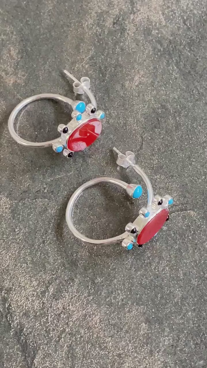 Black Onyx, Turquoise, Carnelian Earrings, Sterling Silver Hoop Earrings, Turquoise Jewelry, Unique Gemstone Earrings, Gift For Her